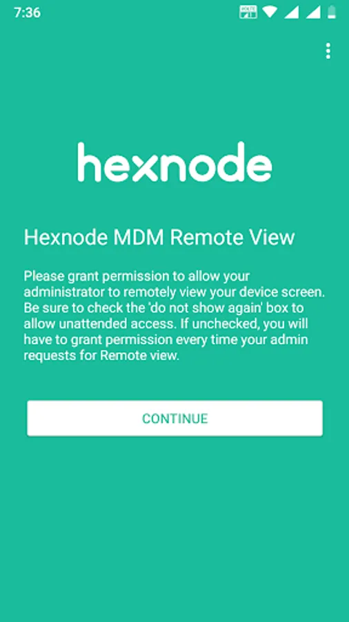Hexnode MDM Remote view service enables your administrator to view your device screen remotely to provide you real-time support or help you with training. To enable remote view, your Enterprise should have a subscription to the Hexnode Mobile Device Management solution and have the Hexnode MDM Android app installed on your device.