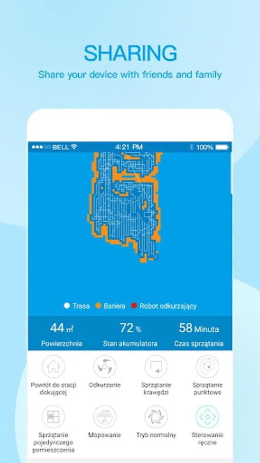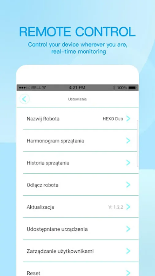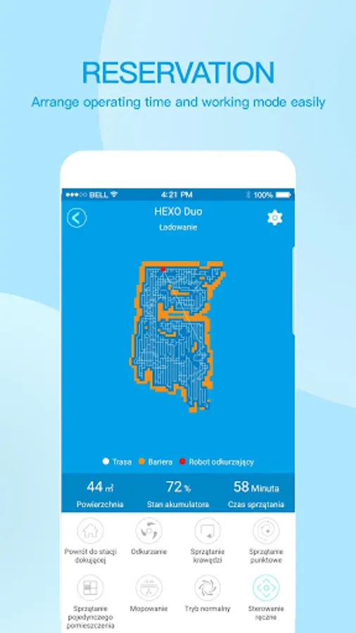 The HEXO Home mobile application allows remote control of HEXO cleaning robots. Using the application you can: