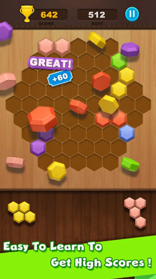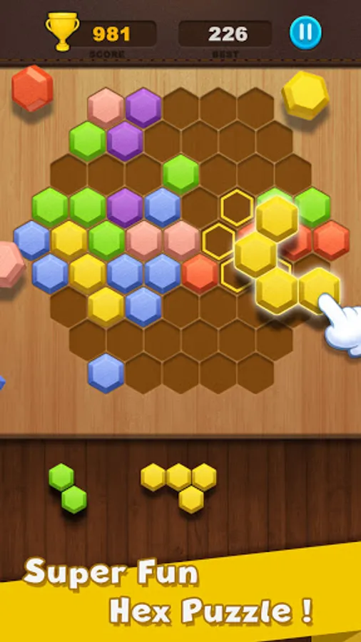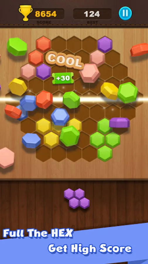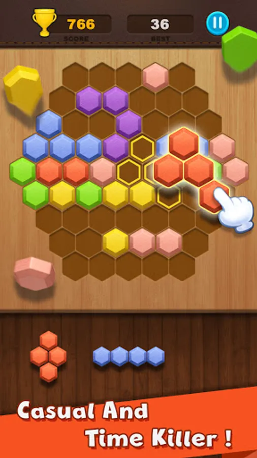 Combine bricks by dragging blocks of different shapes in the blank spaces and the solid lines on the hexagonal board, and get amazing combo rewards.