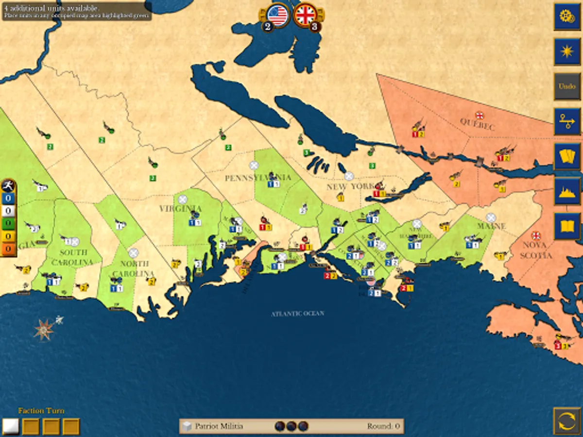 Now you and your friends command the armies of the British Redcoats, English Loyalists, German Hessians, American Regulars, Patriots, French Regulars and Native Americans to decide the fate of the Americas. Players from each faction cooperate to gain control of key towns and forts. Share the fun in this light and fast paced game vs the AI, hotseat or online!