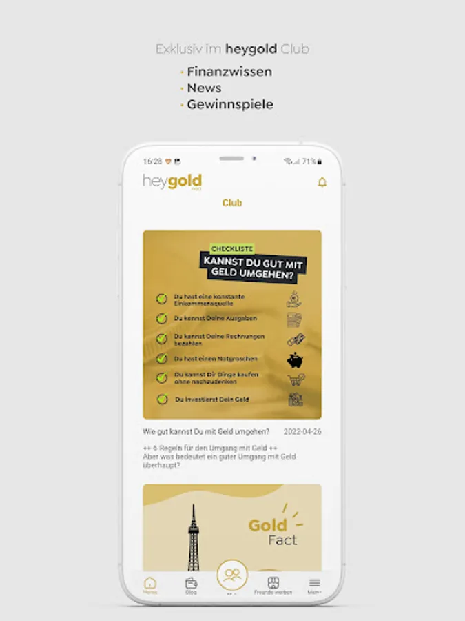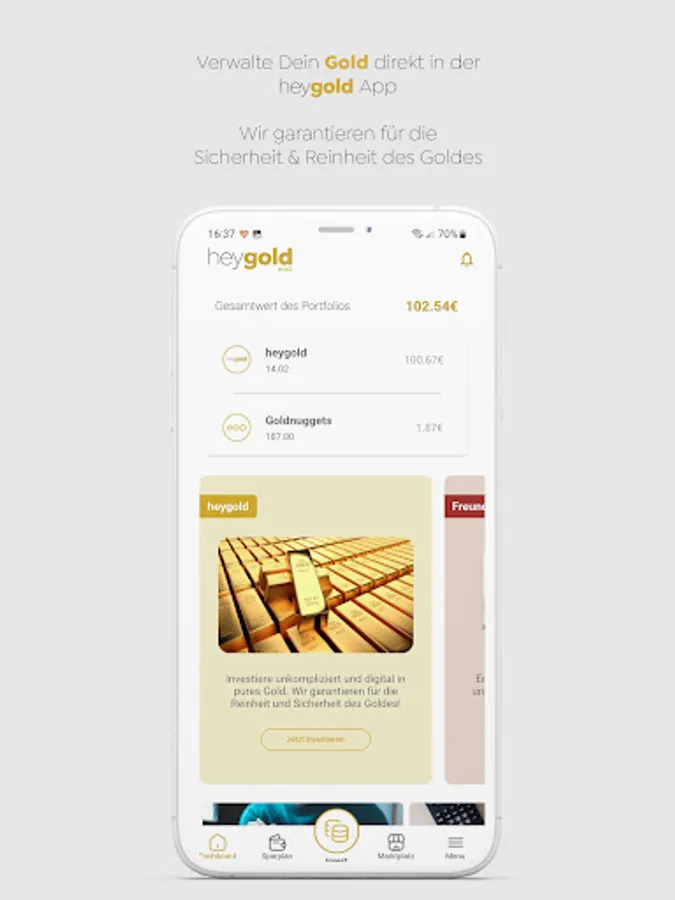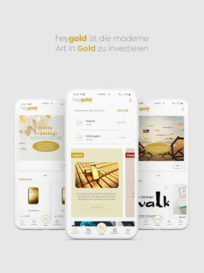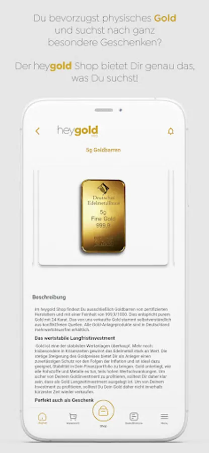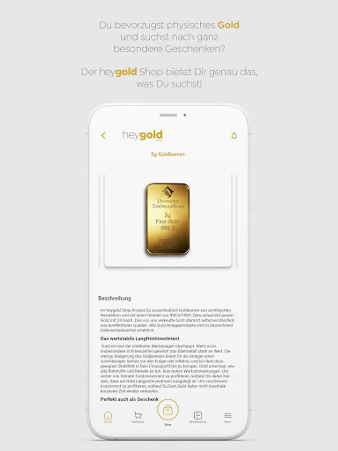 Discover the heygold worlds and invest in gold and other crisis-proof real assets directly via the smartphone app. With our cashback system you can also collect pure gold when shopping in more than 900 partner shops. You want to buy physical gold? No problem, in the heygold shop you will find a wide range of gold bars and exclusive gift ideas. The heygold Club, on the other hand, helps you to find your way around the world of finance and provides you with interesting facts about gold and finance.