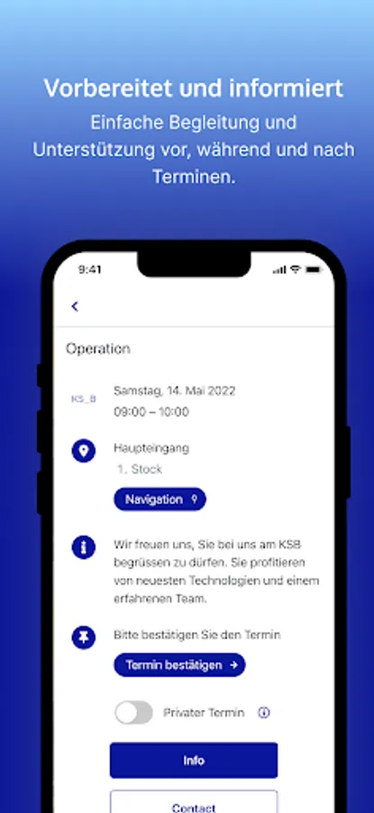Whether appointments, data, tips or maps: With the KSB app, you always have all the documents relating to your stay in the Baden Cantonal Hospital to hand on your mobile phone. Register online or fill out your questionnaires directly in the app.