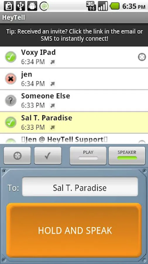 ✳ TIP: Back up your account so that you do not have to re-add friends when you change phones or update ROMs. To do this, exit HeyTell and enable the Backup options accessed via Menu > Settings > Privacy or Backup & Sync.