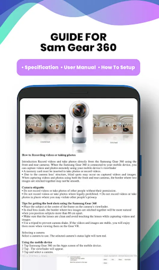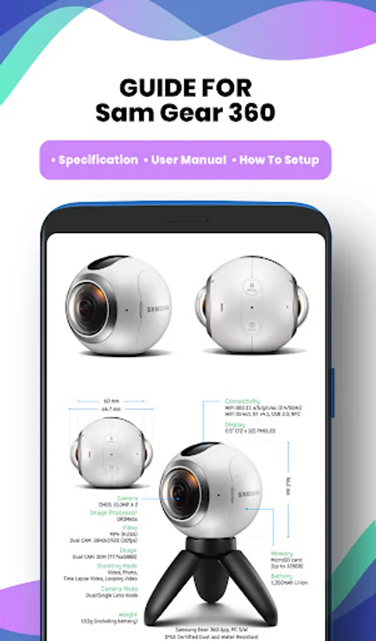 Guide For Samsung Gear 360 is app that contain all information about specification, user manual, Feature, How to setup From Samsung Gear 360.