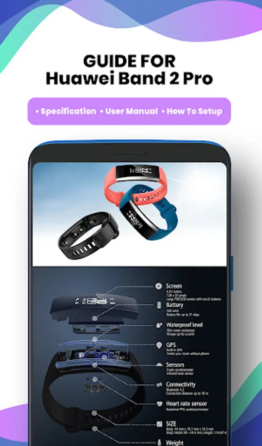 Huawei Band 2 Pro guide is app that contain all information about specification, user manual, Feature, How to setup From Huawei Band 2 Pro.