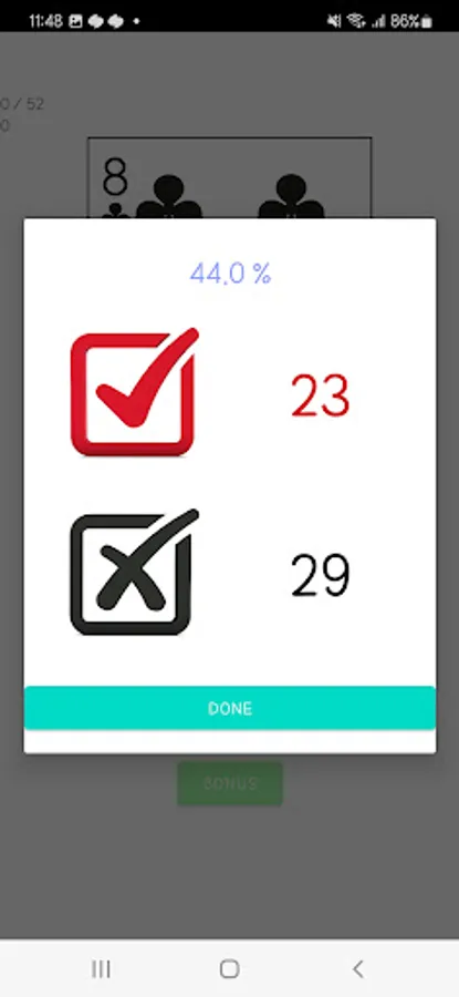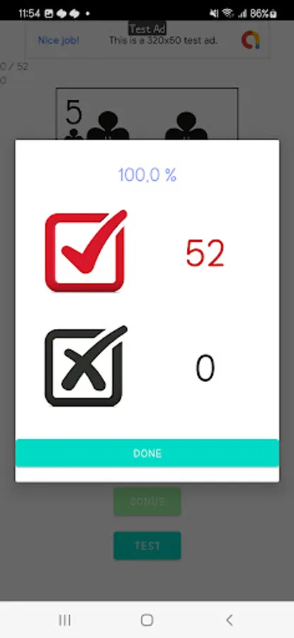 (6) At the end of test, after 52 random cards pass, the results will showing