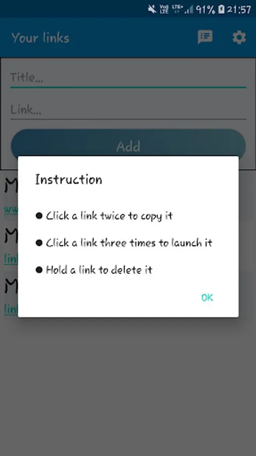Application is used to store links and its tittles. If you want your data to be protected, you can create a password in order to keep it safe. Everything you save in the app, remains in the app, so you can be sure that nobody but you has access to this.