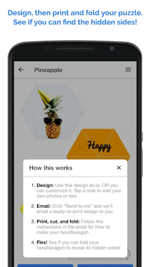 Pricing: After printing 5 hexaflexagons for free, a $3.99 in-app purchase buys you unlimited access to have hexaflexagon designs emailed to you so that you can print, fold, and solve them.