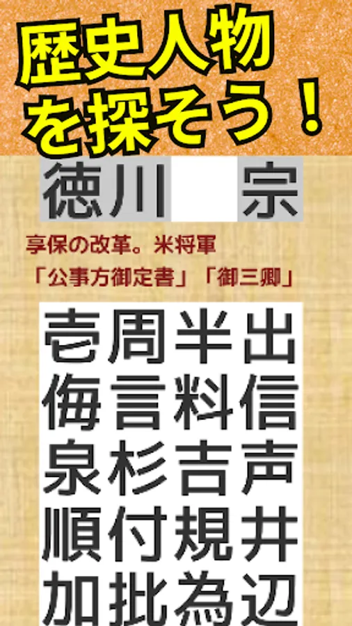 Let's create a historical figure using the many kanji displayed in this app! It will be a kanji solitaire game app for brain training.