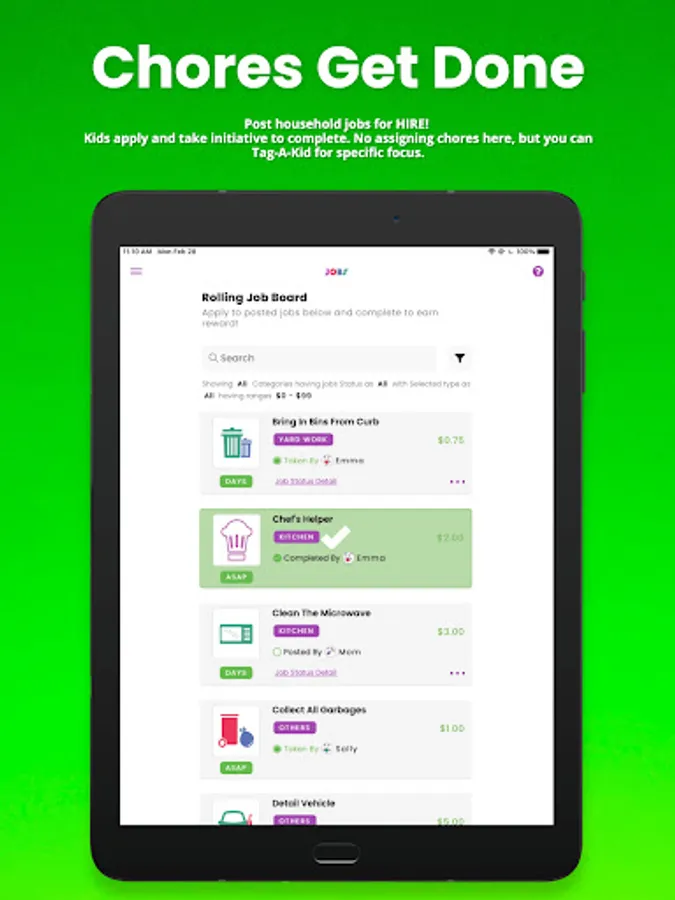 CHORES KIDS CHOOSE TO DO - post jobs for Hire and customize to the rolling job board, kids go in and apply to take a job(s) each new pay period.
