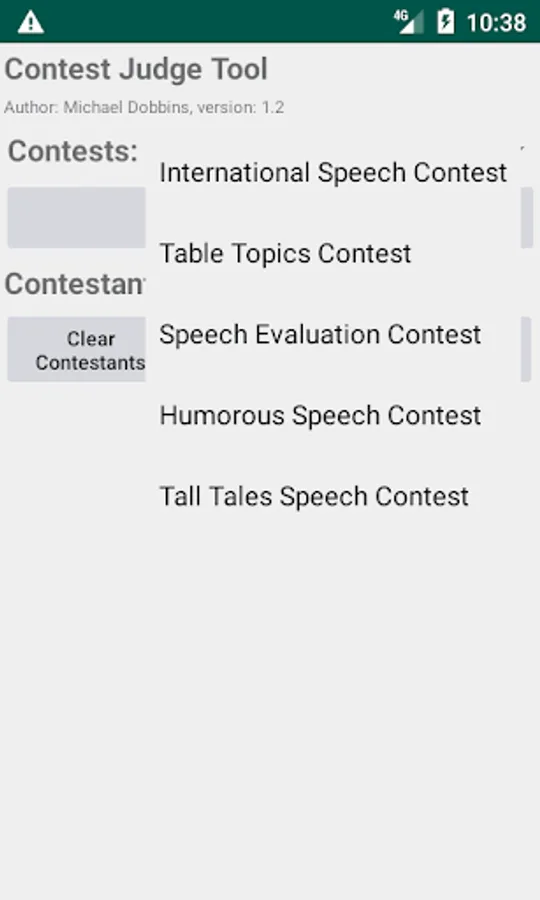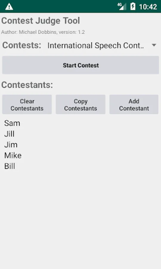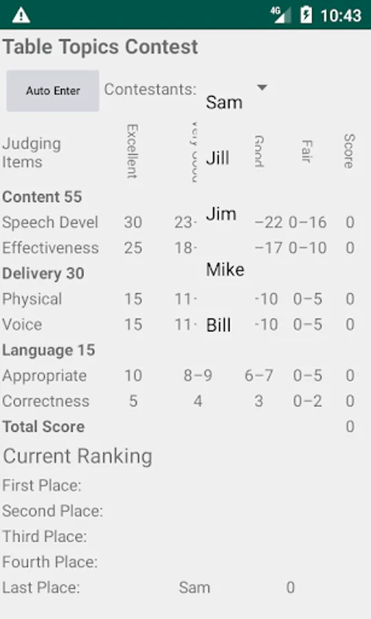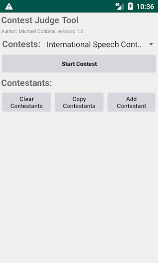 ContestJudge is tool to help contest judges calculate results in a Toastmasters™ contest. Input contestants for any of the contests from a contest agenda ahead of time. During the contest, select each contestant as they appear on stage and give each evaluation category a number. Contestants will be sorted in finish order automatically. Copy the contestants names to the paper ballot and give to the Chief Judge to be counted.