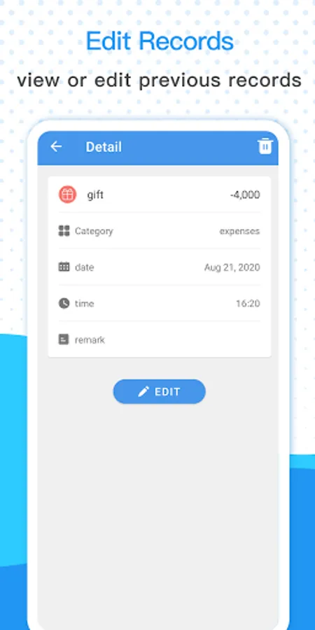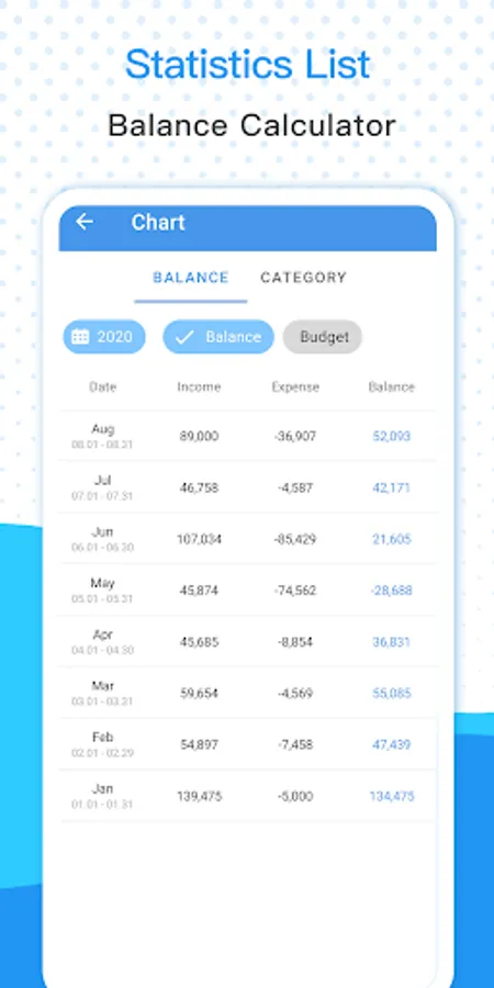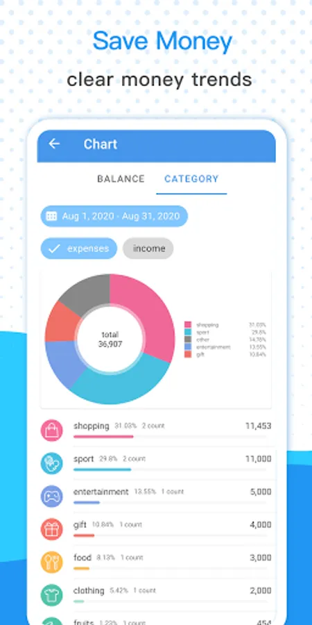 Money statistics charts and reports can be generated automatically, and you can view the trend of expenses, incomes, balances and budgets by defining the dates yourself.
