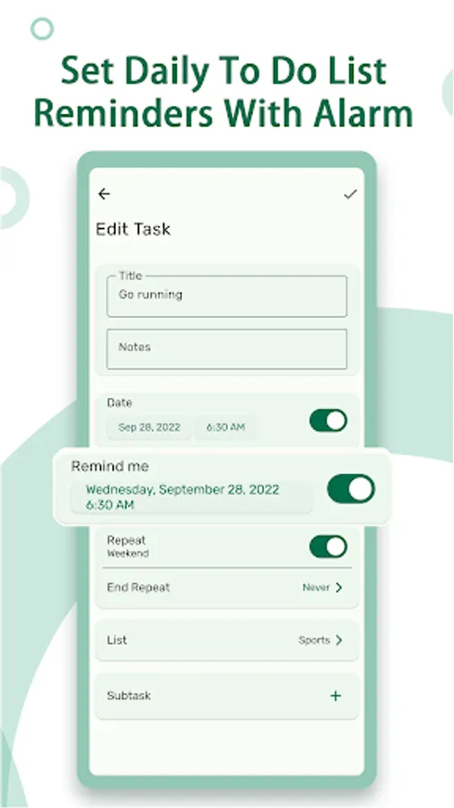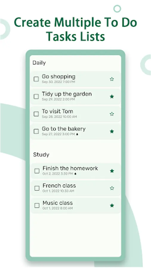 You can set task reminders with alarm for important to-dos to avoid forgetting. Support repeat to-do list reminders.