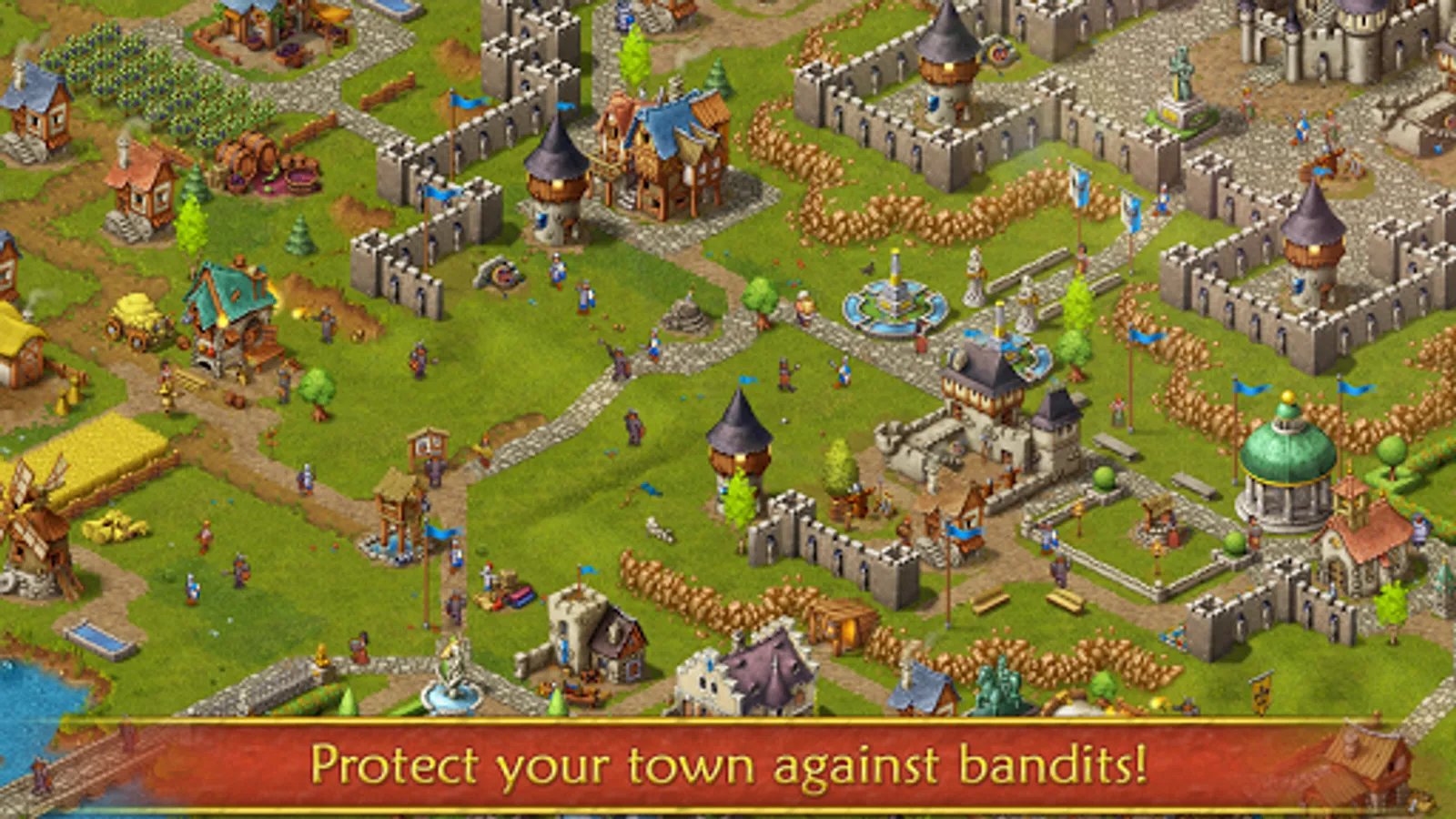 Develop your tiny village to a grand medieval empire with a thriving economy and happy villagers! Find spots for mining ore, harvest the crops of your farms and collect coins as taxes from your folk. Build jousting fields, taverns, marketplaces and beautify your city with impressive statues, magnificent monuments and lush gardens. But there are also dangers lurking close by. Bandits are in the area, looking to plunder and pillage your peaceful town. Build barracks, guard towers and recruit brave soldiers to protect your citizens from harm. You rule the whole empire from your castle and make sure your inhabitants have fun and stay happy!