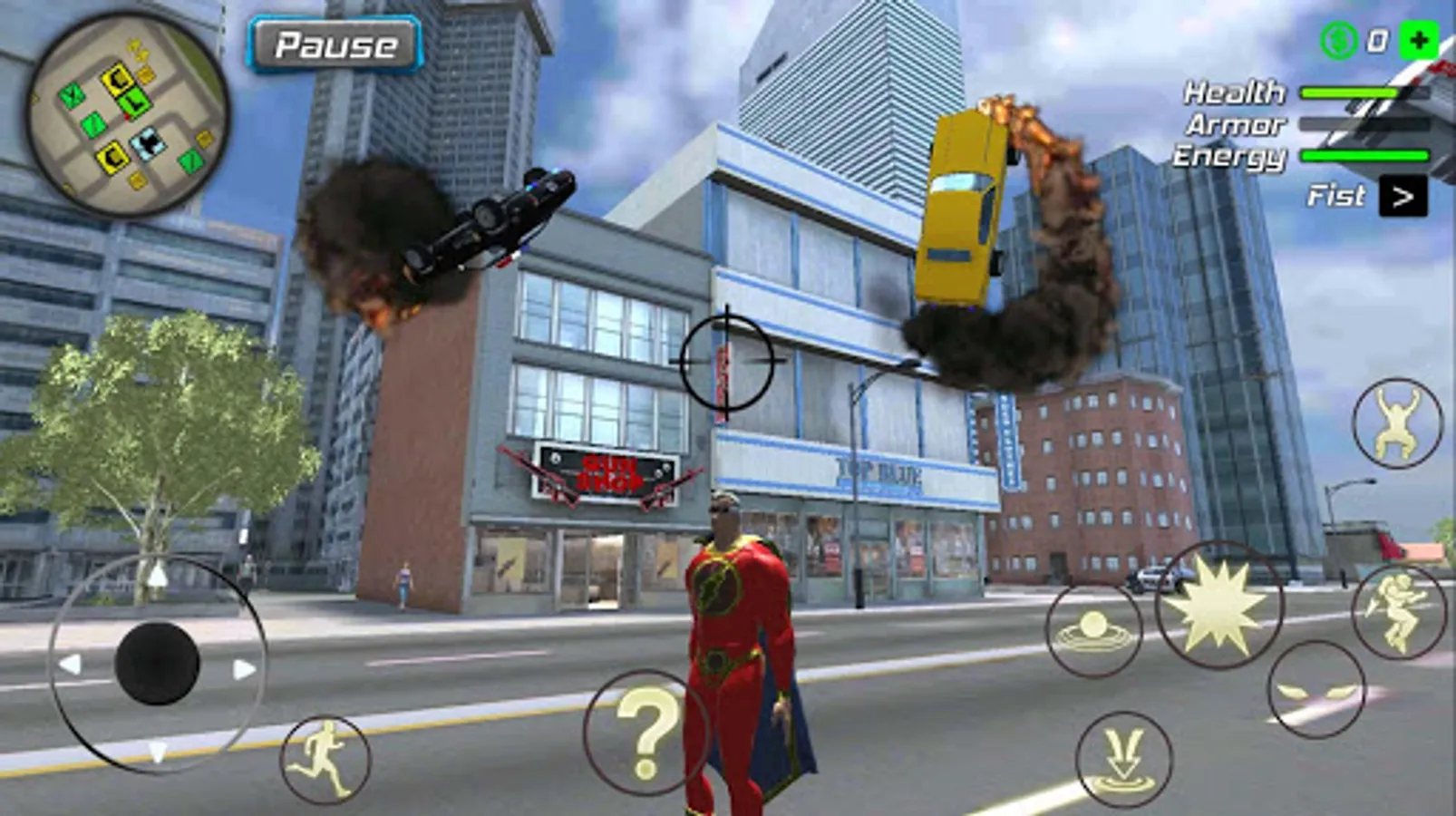 The style of city is similar to Miami or Las Vegas but actualy it's New York. Your legs also very powerful. Don't underestimate them. Don't mess with the police, they are the good ones. Dominate the city with a devastating firepower of advanced military vehicles or upgrade your hero to knock down enemies in a few kicks! Let it be a beautiful city, do not turn into crime city with blood and robbery. You play is a hero / legend and whole city fears you.You can shoot a rope to a building and climb over the building to the top. You have special real powers. You can shoot dangerous laser beam from your eyes.