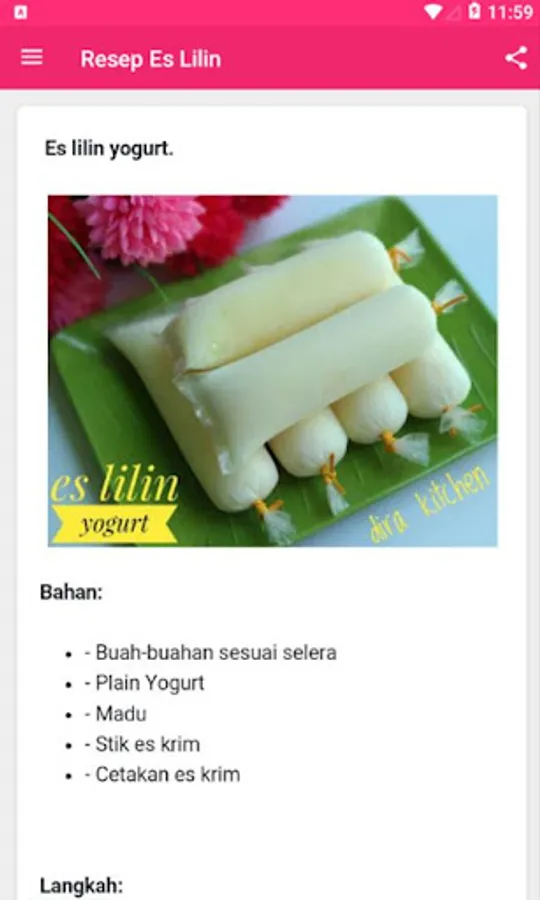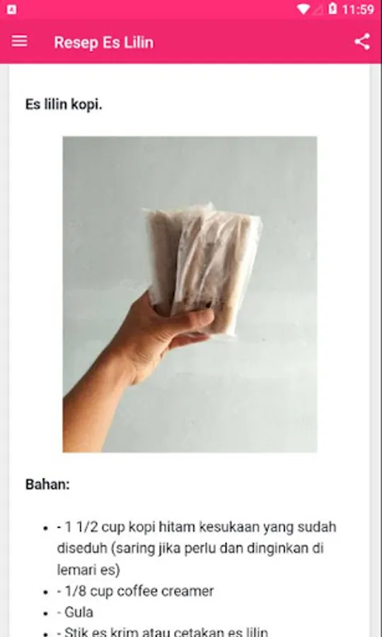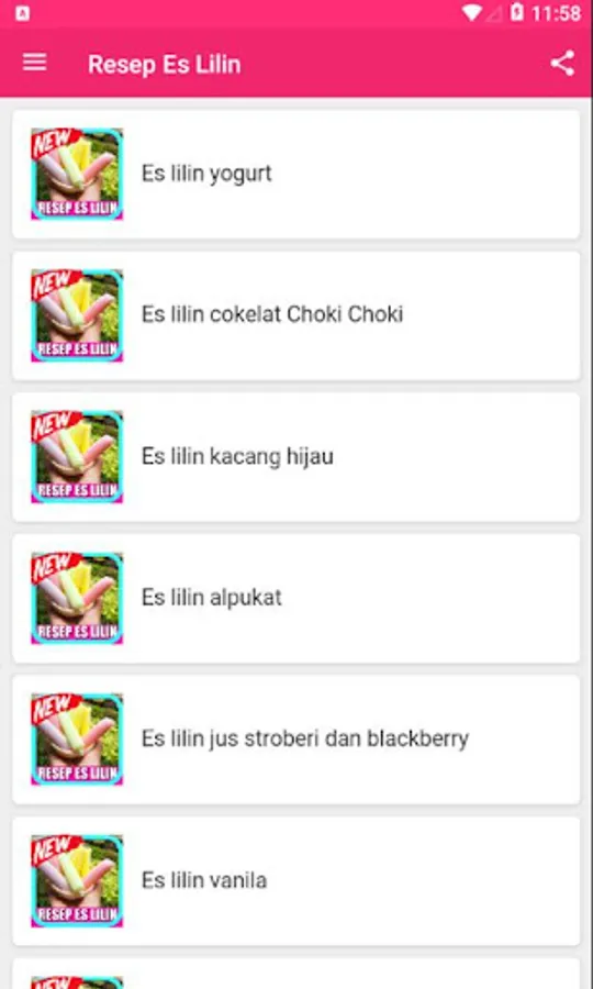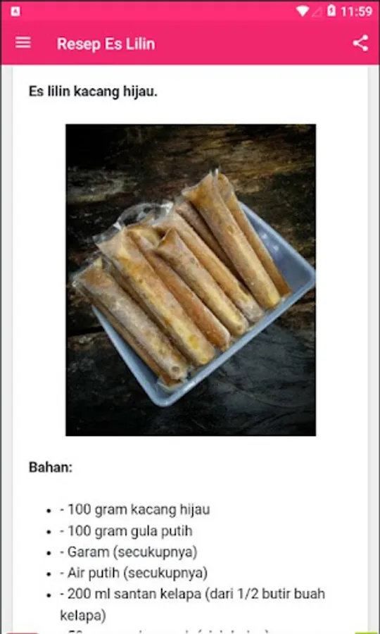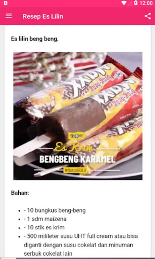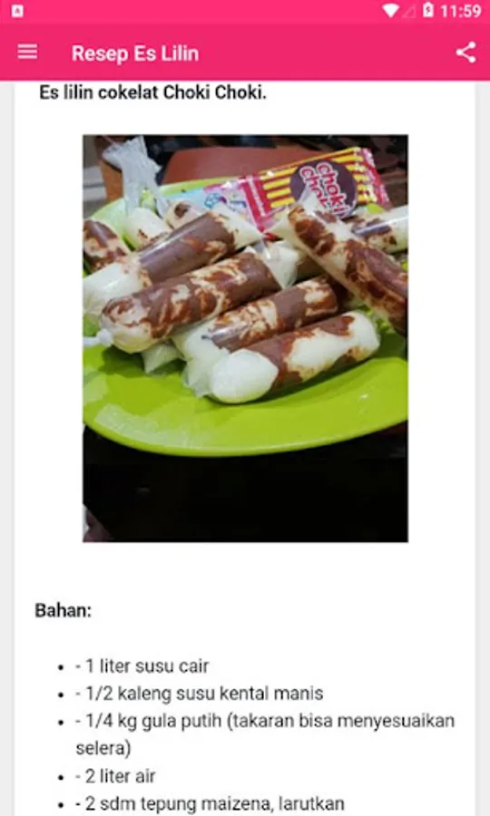 In this Ice Wax Recipe application, there are several ice wax recipes that are worth trying out such as the Nutrijel Pelangi Ice Candles, Green Bean Candles, Mango Ice Candles, Pop Ice Candles, Oreo Ice Candles, Milk Ice Candles, Milk Ice Candles Jelly, Durian Milk Pencil Ice, Dog Lilin Ice, Black Sticky Rice Ice and many other interesting recipes.