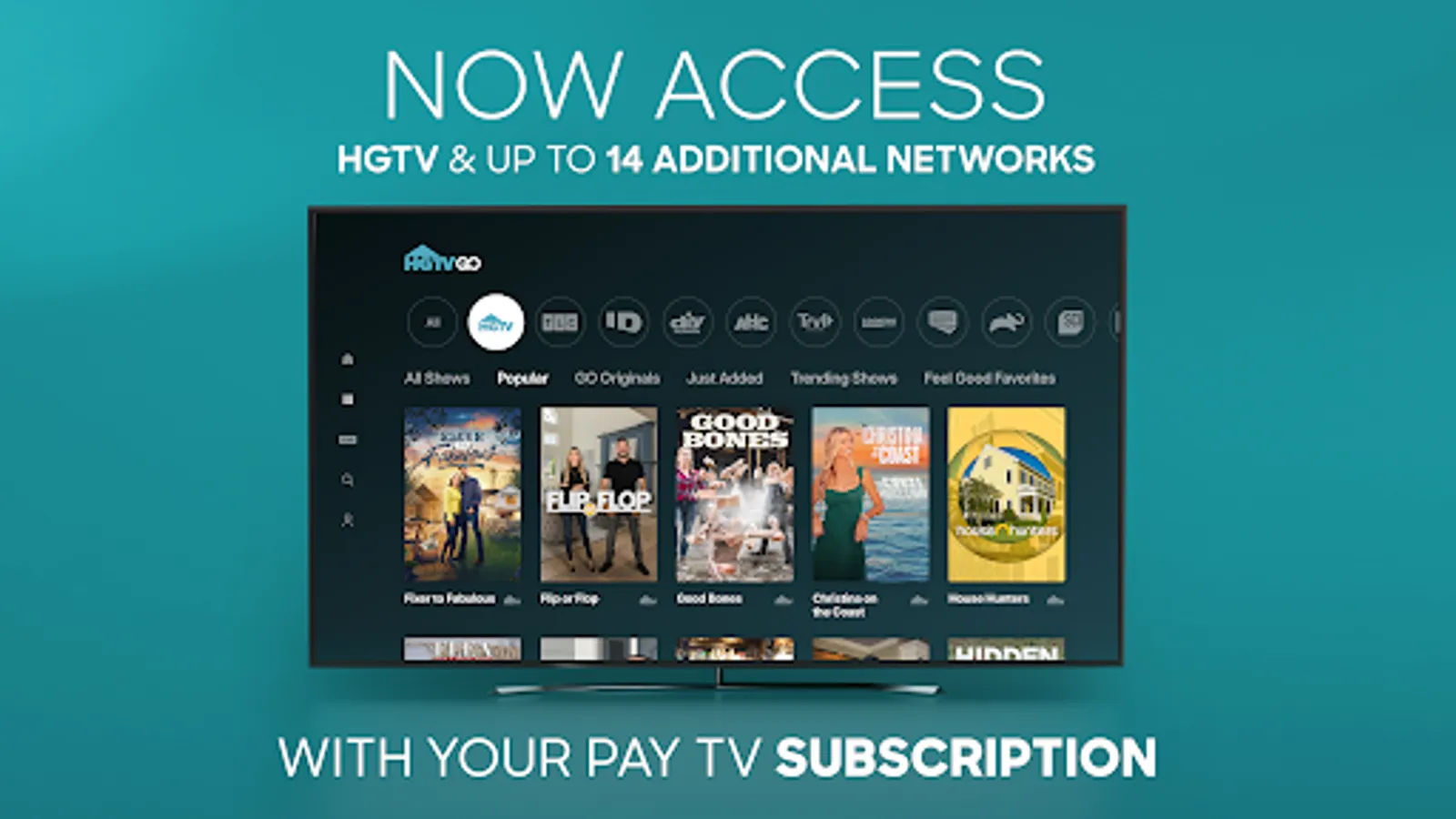 Catch up with your favorite HGTV shows anytime, anywhere with the all-new HGTV GO app - and now get access to up to 14 additional networks including TLC, Food Network, ID, Discovery and more - all in one app. It’s FREE with your pay TV subscription.