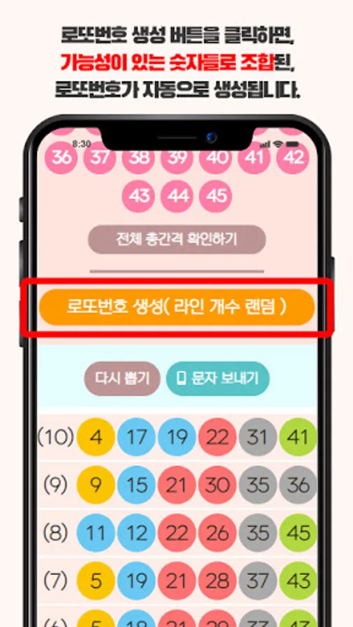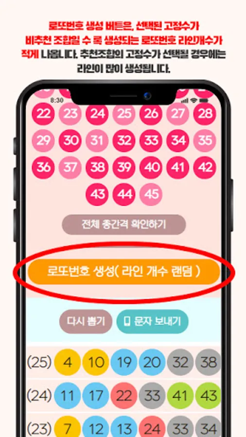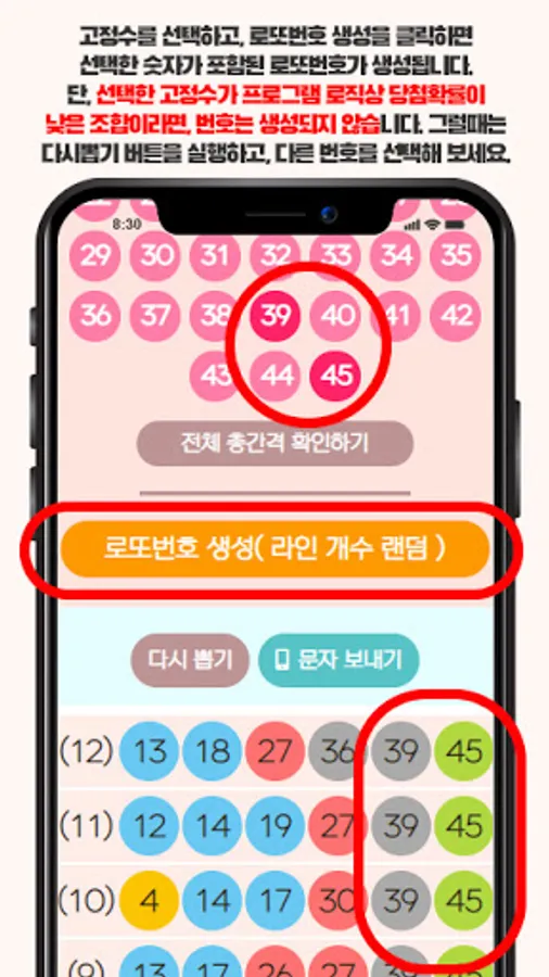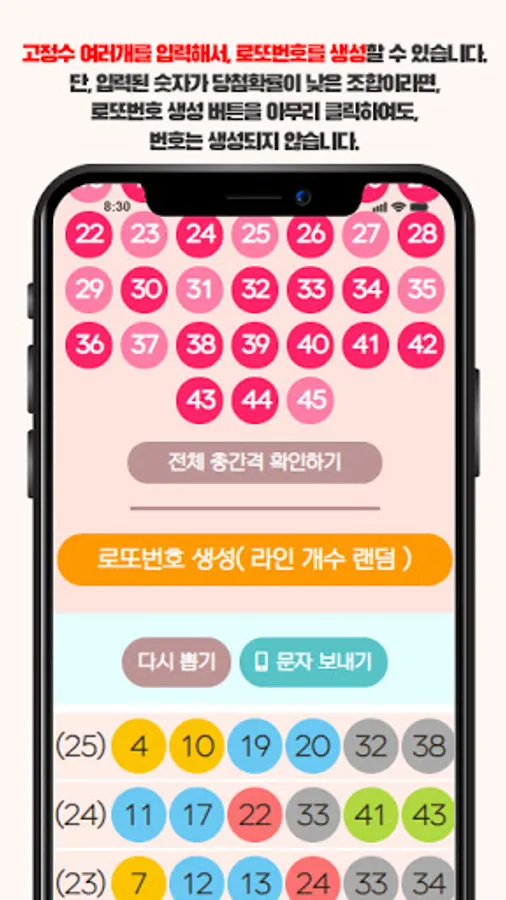 By choosing a fixed number, you can create a lotto number. If the selected numbers are numbers that do not come out well when viewing the winning pattern of the lottery number, no matter how many times the number generation button is clicked, the lottery number is not generated. In that case, click the Redraw button and try generating the number again.