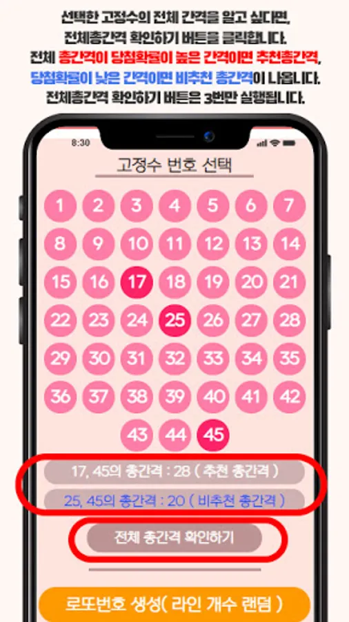 If you want to know the total spacing of the selected fixed number, click the Check Total Total Spacing button. If it is the total interval of the recommended combination, the phrase "Recommended interval" appears, and if the interval of the non-recommended combination, the phrase "Not recommended interval" appears. The button to check total total interval is executed only 3 times.