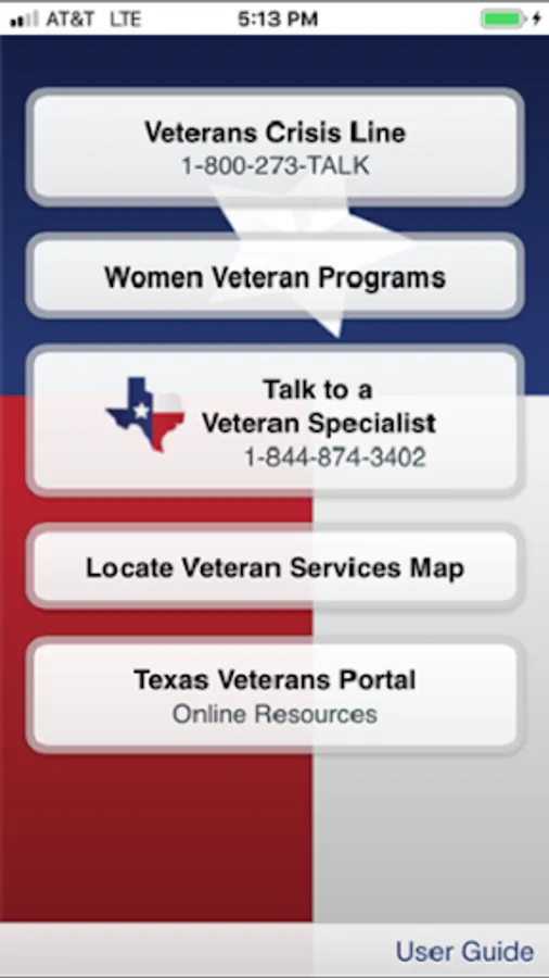 The Texas Veterans App is a mobile application designed to provide U.S. Military Veterans easy access to the Veterans Crisis Line, Hotline for Women Veterans, Connect with Texas Veterans, Texas Veterans Hotline, and the Texas Veterans Portal. The Veterans Crisis Line and Hotline for Women Veterans are nationally supported help lines. The Connect with Texas Veterans option provides a number for users to call and request help with connecting to other veterans within their geographical area of Texas. The Texas Veterans Hotline provides information on veteran’s benefits. The Texas Veterans Portal option allows a user to easily access additional online resources located on the http://veterans.portal.texas.gov/en/Pages/default.aspx web page.
