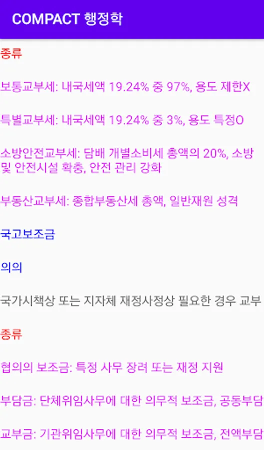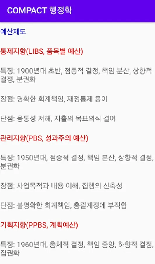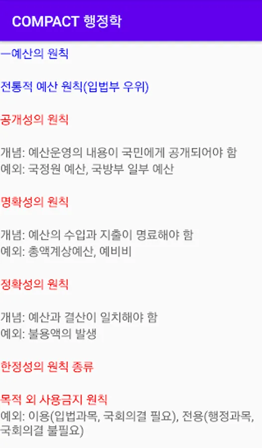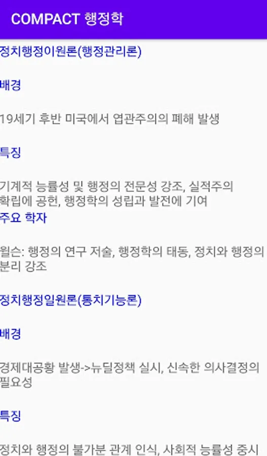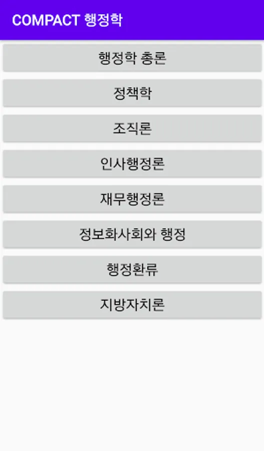 《COMPACT Public Administration》 is a summary of major concepts of public administration. It contains high-quality content that can cultivate basic knowledge about public administration, as well as preparation for public administration exams. In addition, it consists of a simple system that can be freely studied without temporal and spatial restrictions. Through this application, I wish I could achieve my desired goal.