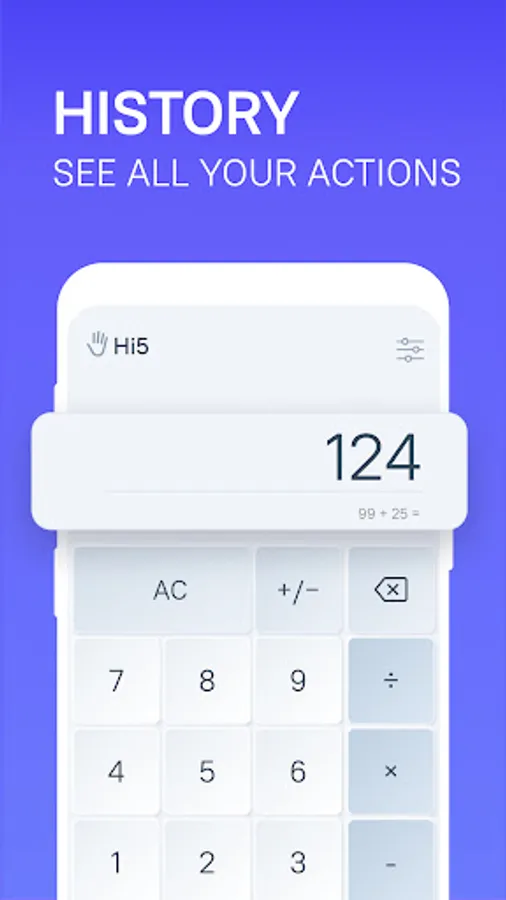 Calculator is a free, simple and handy application that will help you easily solve math problems. You will certainly be delighted with the absence of ads, fast start-up and stylish design. For your convenience, we display the history of calculations and you can save not only the result, but also the entire chain of calculations. If you make a mistake when typing numbers or operations, you just need to delete the wrong character and continue the calculations.