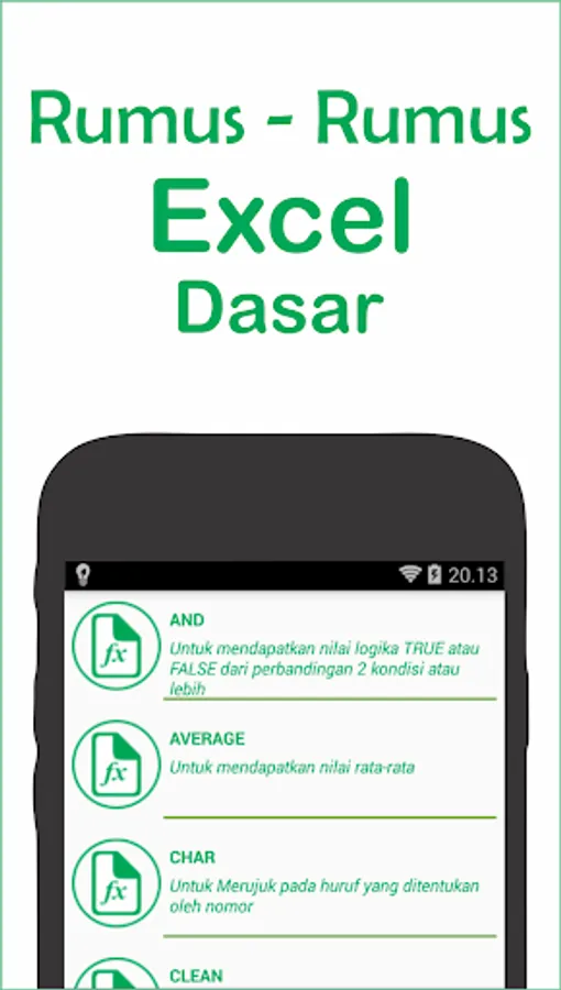Complete Excel Formula and Learning Case Example is an application collection of excel basic formulas such as SUM, MIN, MAX, COUNT, AVERAGE, etc. as a guide when you are looking for a complete excel formula. In addition there are also examples of cases that are easy to understand and we will always update regularly. Complete Application of Excel Formulas and Case Examples can be your guide if you want to solve a case because there are dozens of basic formula formulas and dozens of case examples.