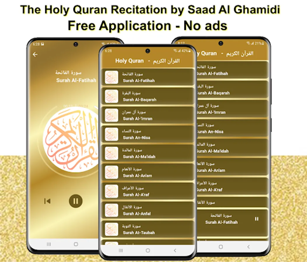 The application of the Noble Qur’an recitation by Saad Al Ghamidi, allow you to listen to all chapters of the Holy Qur’an without Internet from your cell phone or your tablet and enjoying with the voice of Sheikh Saad Al Ghamidi that transports you to another world with his distinctive voice.