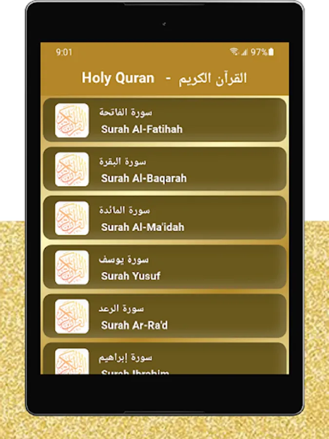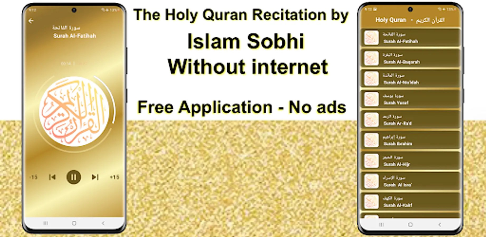 The application of the Holy Qur’an recitation by Islam Sobhi , allow you to listen to the Holy Qur’an without Internet from your cell phone or your tablet .