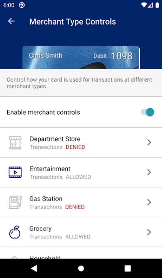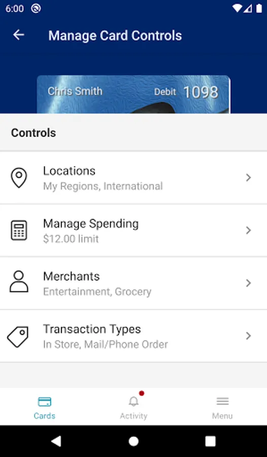 Spending limits can be established to allow transactions up to a certain dollar value and decline transactions when amounts exceed your defined thresholds. Transactions can be monitored and managed for specific merchant categories such as gas stations, department stores, restaurants entertainment, travel, and groceries. And your transactions can also be monitored for specific transaction types: in-store purchases, e-commerce transactions, mail/phone orders and ATM transactions.