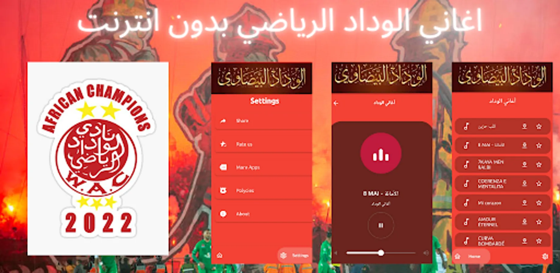 Wydad Music App is a free application. Provide all winners ultras musics without internet.