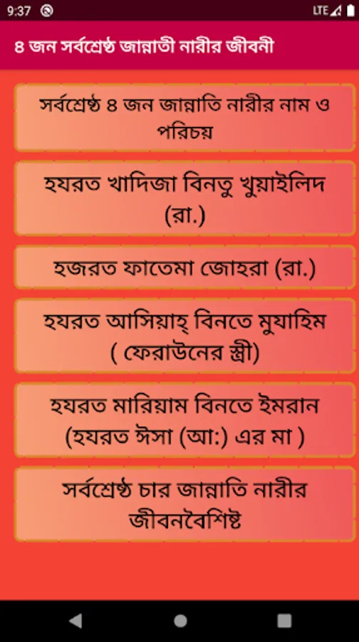 The Messenger of Allah (peace be upon him) once cut four spots and asked the Companions, "Do you know what these are?" The Companions replied, "Allah and His Messenger know best." The app has been created with the names and details of the four paradise women that the Prophet (peace be upon him) spoke about.