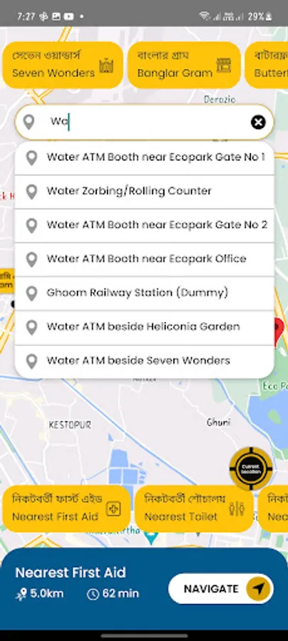 2. In this mobile app, there are seven shortcut navigation buttons (both in Bengali and English) for the main attractions of the Eco Park. Those buttons are at the top of the App screen. The buttons are Seven Wonders, Banglar Gram, Butterfly Garden, Toy train, Mist Garden, Boating Ticket Counter, Water Zorbing.