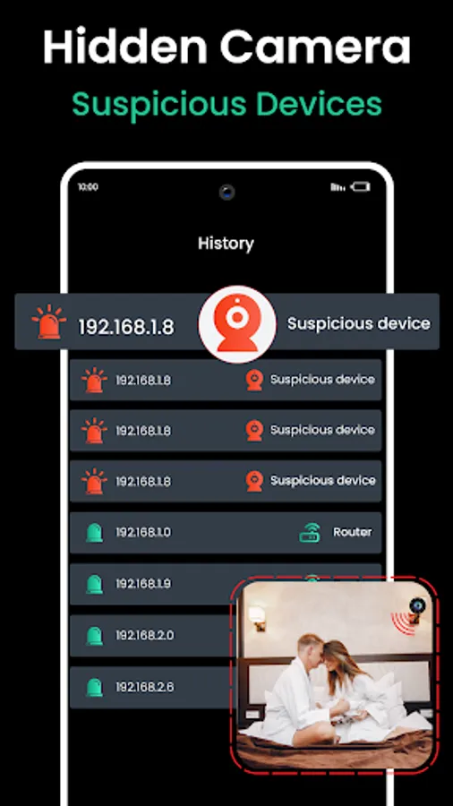 With few clicks easily find Quadrooter, IR cam, microphone or any hidden devices in living room or in hotel or changing room. Just check these places using our spy camera finder and if you find nothing, it will already mean that this place is safe with a high degree of probability. Be vigilant in any situation - download hidden camera detector and spot spy cameras or hidden microphone. If you are worried about being eavesdropped on or interfered with in any way in your personal or corporate life, this hidden device detector is a great choice to keep you safe.