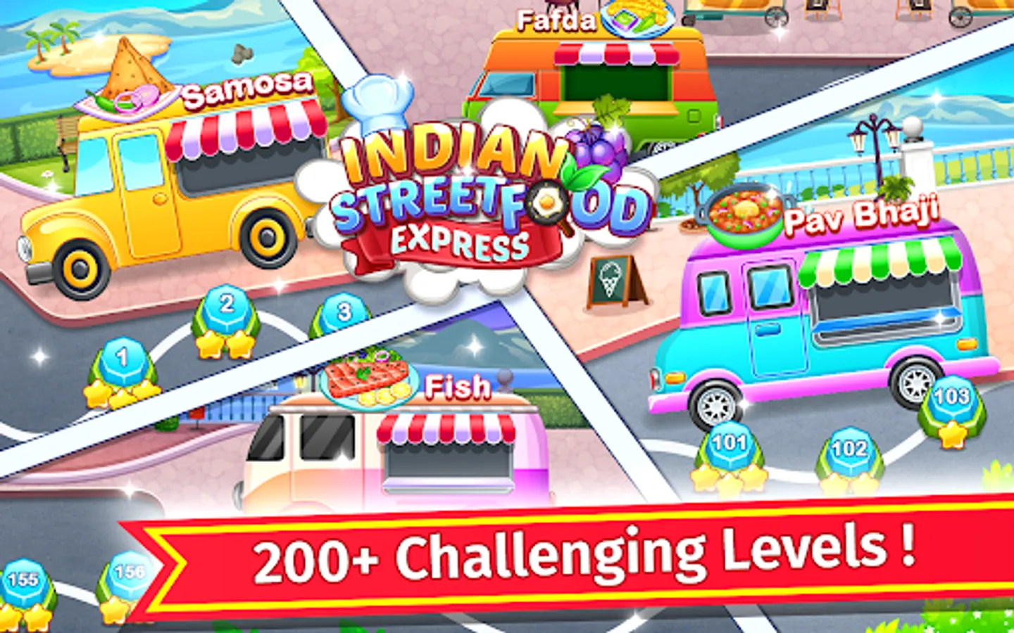 Indian Street Food Express is a fast paced cooking game with thousands of levels to serve local Indian food in a variety of food trucks. Play as a Chef in this Fast& fun cooking simulation games! Foods to cook & serve in this free cooking game are Samosa , Fafda, Vadapav, Thepla,Pav Bhaji, Jalebi, Dosa, Khaman, Chhole Bhature, Fish Curry, Hyderabadi Biryani, French Fries, Omelet and many more!!
