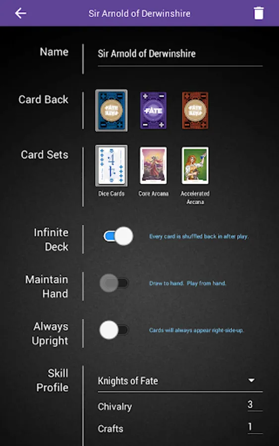 • Use the “Always Upright” setting to keep your cards upright always, or leave it off, if you want to use alternate interpretations for inverted cards.