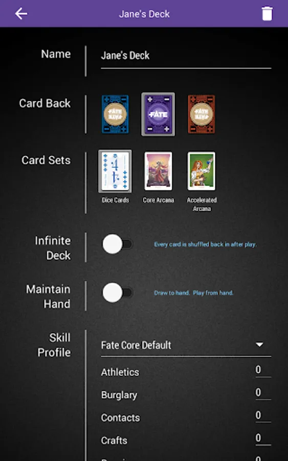 • Use the “Infinite Deck” option to reshuffle after every draw, for dice-like randomization.
