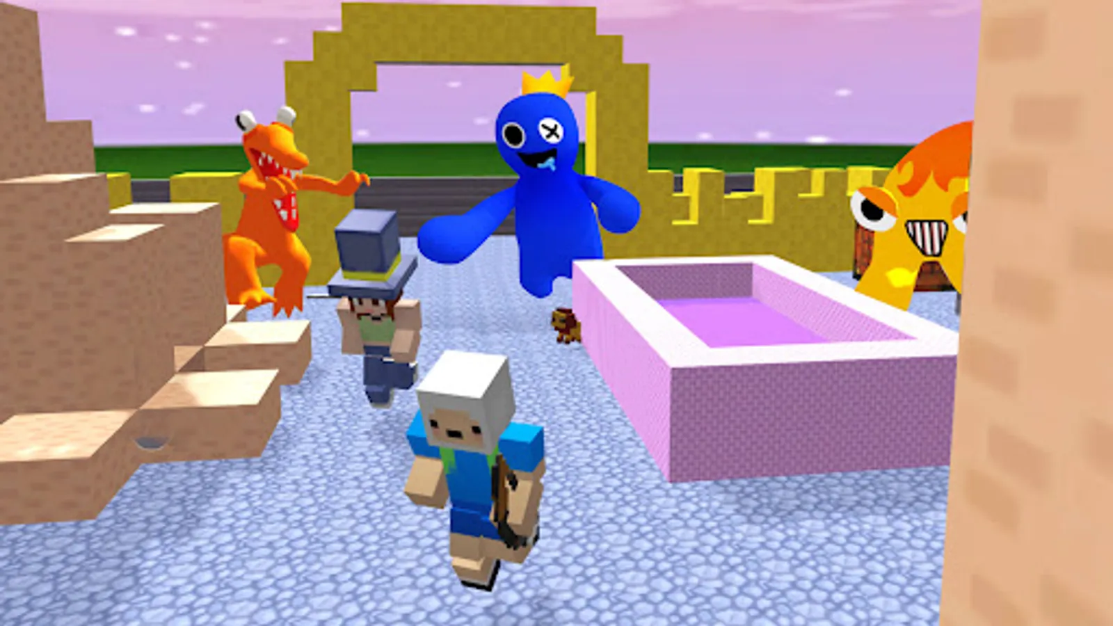 In Hide N Seek: Craft Playtime, you can play as a hider, find potent weapons, and evade the Rainbow Friend or you can become a monster that hunts the hiders.