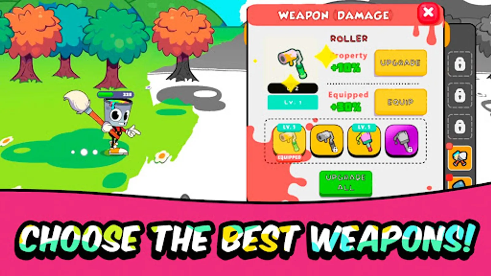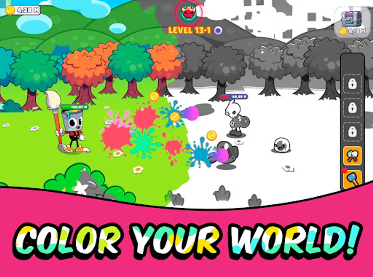 Ink Slayer is a unique idle RPG where your mission is to paint a world that's completely black and white with a burst of colors. As you progress, the grey world starts transforming into a lively and colorful one, and you'll need to reinvest your resources in various painting techniques and tools. You'll encounter different challenges and enemies, including pesky black-and-white creatures that will try to undo your hard work. To progress further, you'll need to upgrade your painting skills and unlock new areas to colorize. The greyed creatures and enemies will be more and more challenging, so you need to invest wisely!