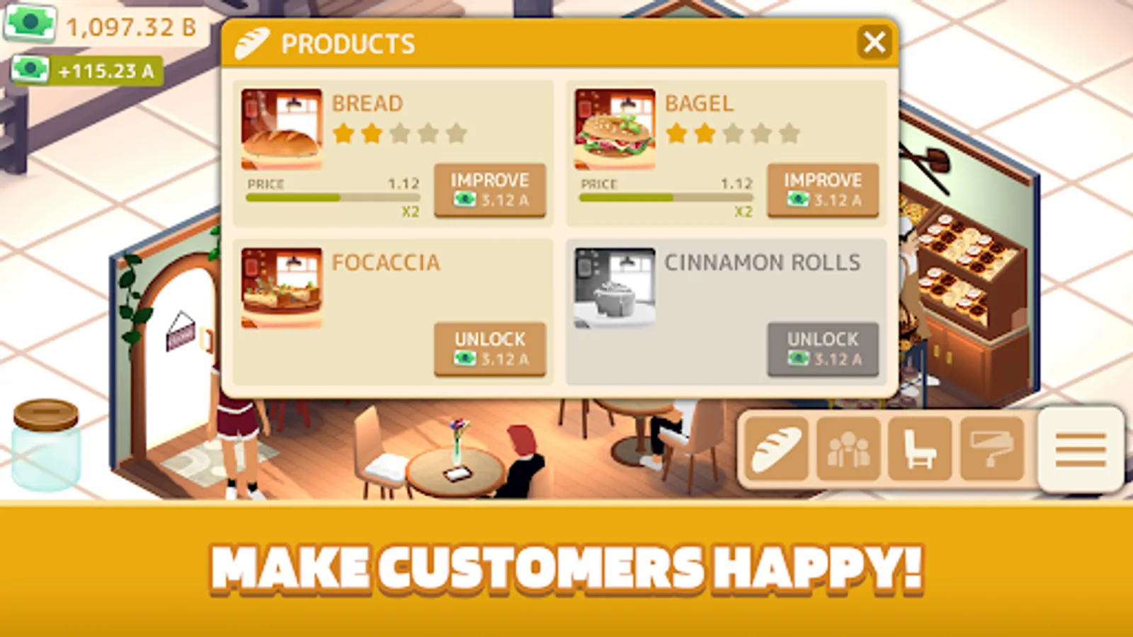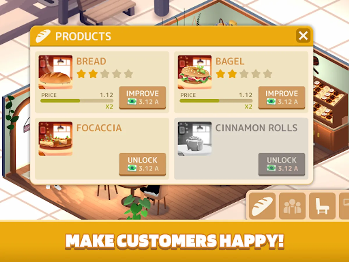 In this yummy game, it's all about making the right decisions to expand your business. Utilize your earnings wisely to reinvest in expanding your facilities, enlarging the dining area, and unlocking a delightful array of new recipes. From mouthwatering cinnamon rolls and bagels to various types of bread, there's no limit to the delicious creations you can offer.