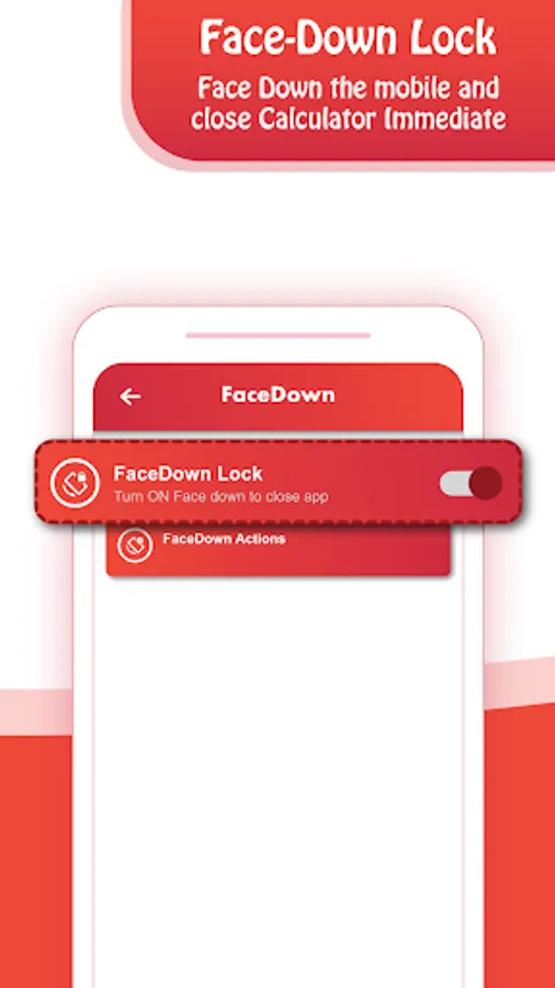 - Enabling Face Down from settings will let you set the action of taking care when someone came suddenly and you just face down your phone and calculator vault will close immediately. for example close app, open another app or open any website
