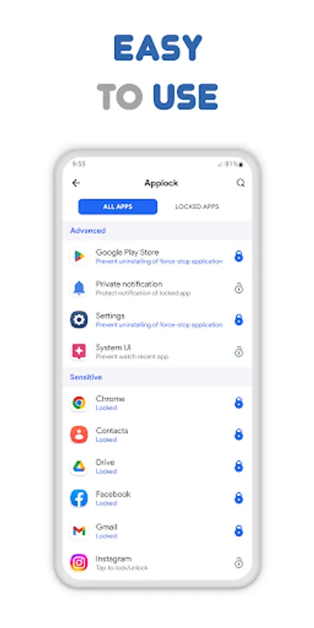 App Lock can lock Facebook, WhatsApp, Gallery, Messenger, Snapchat, Instagram, SMS, Contacts, Gmail, Settings, incoming calls and any app you choose . Prevent unauthorized access and guard privacy. Ensure security.