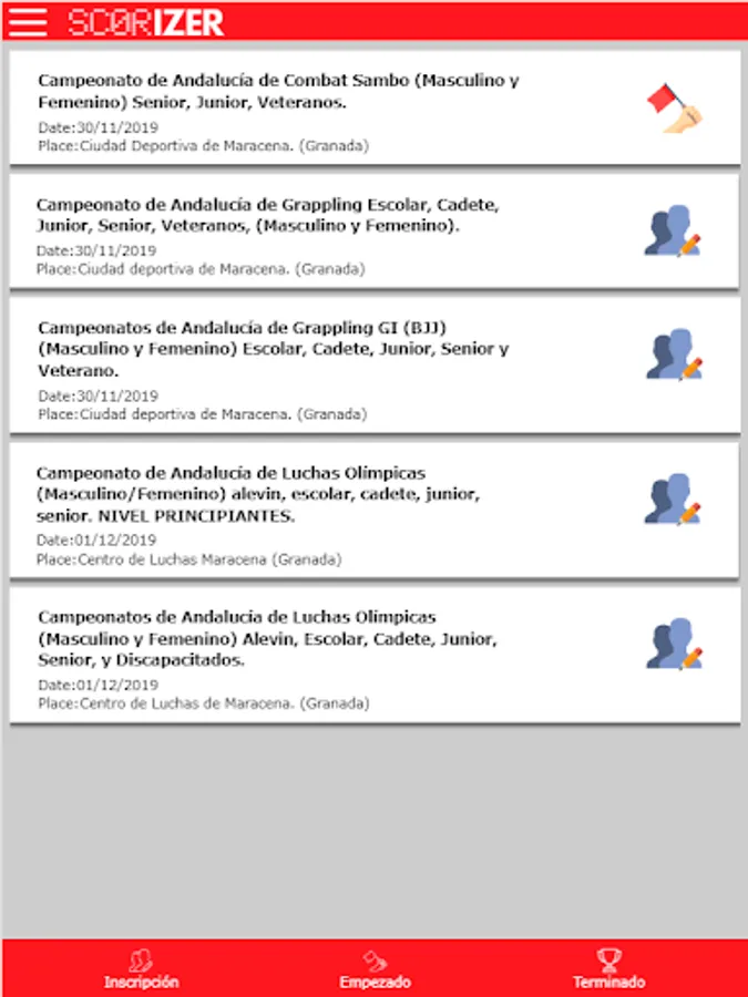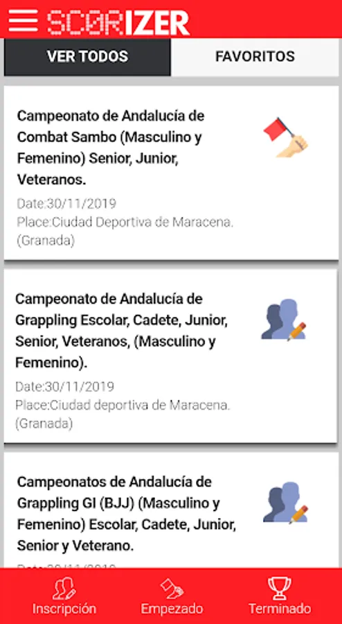 With this application get first-hand and free all the information such as: geo-location, schedules, classifications, streamings, detailed history of sporting events (combat, games, competitions, championships, leagues, cups, etc.) of sports with SCORIZER © computer support.