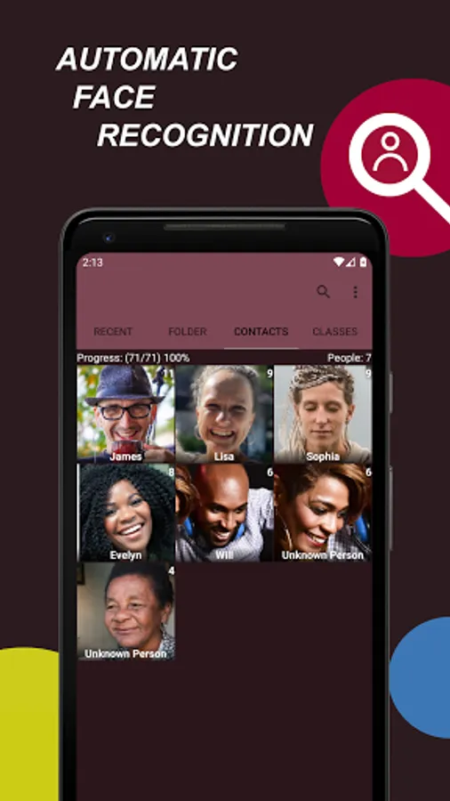 Facial recognition can be performed on all of your images. Individual albums are automatically created for each recognized person. This way, you can check out all pictures of a specific person. If you name people, you can also find them using the search function.