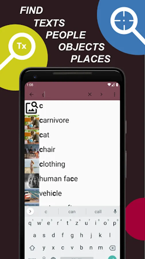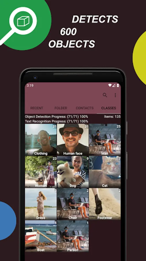 PicSort is also equipped with an algorithm for object recognition. Thus, the content of your pictures can be recognized and automatically be grouped into albums. Of course, this content can also be called up directly using the search function.