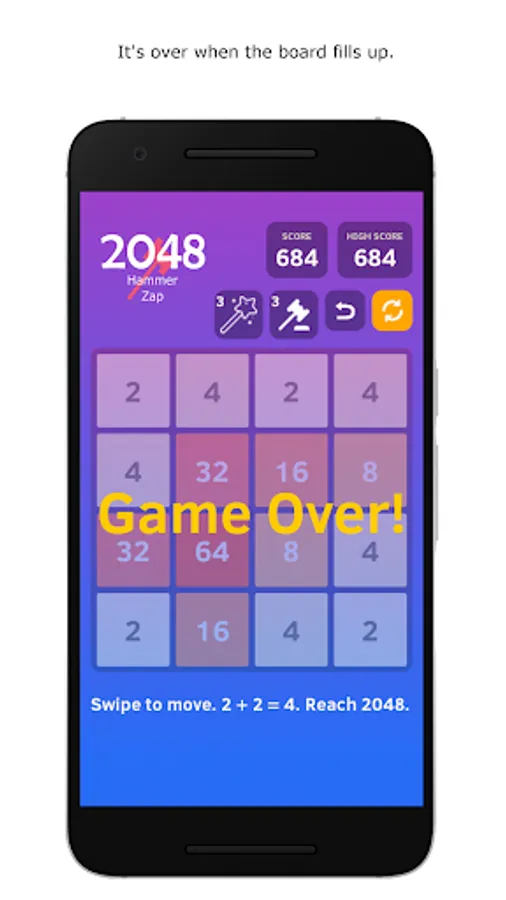 Get the 2048 tile to win a game! Swipe to move all Tiles. When two tiles with the same number touch, they merge into one! It's over when the board fills up.