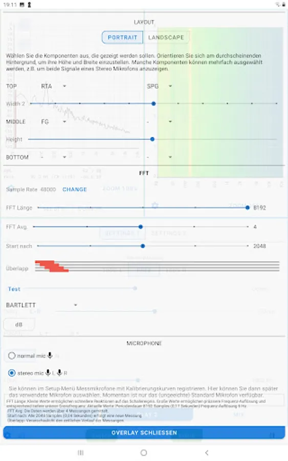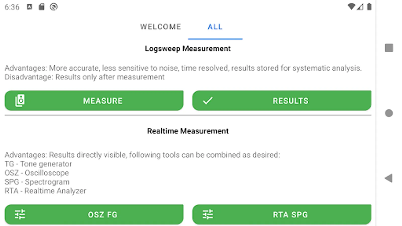 Car Audio Setup can be seen as an acoustic multimeter for real-time measurements: In the car, neither the mounting location of the loudspeakers nor the listening positions can be changed. The focus of the measurements is therefore on optimizing the frequency response. The app provides the necessary tools with function generator, real-time analyzer and spectrogram. In addition, an oscilloscope helps in troubleshooting: Before the first measurement, experience has shown that it should be ensured that speakers and crossovers have been connected and adjusted correctly. In addition to real-time measurements, frequency response and impulse response can be measured via logsweep for more precise analyses.