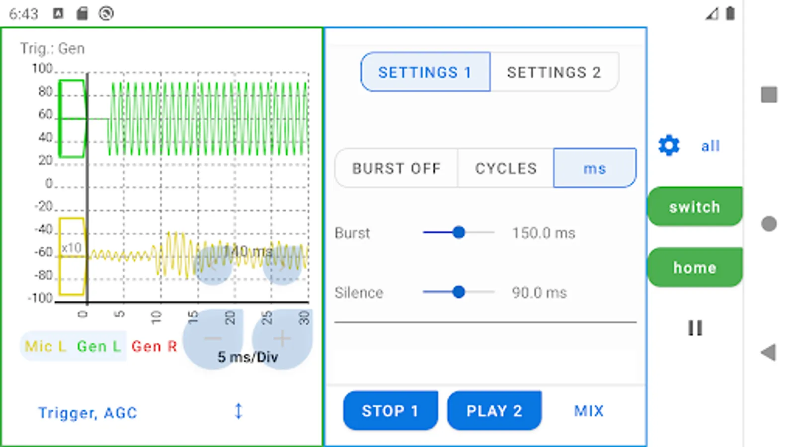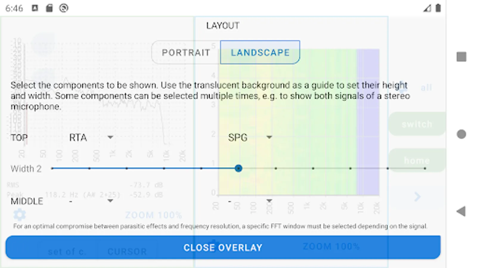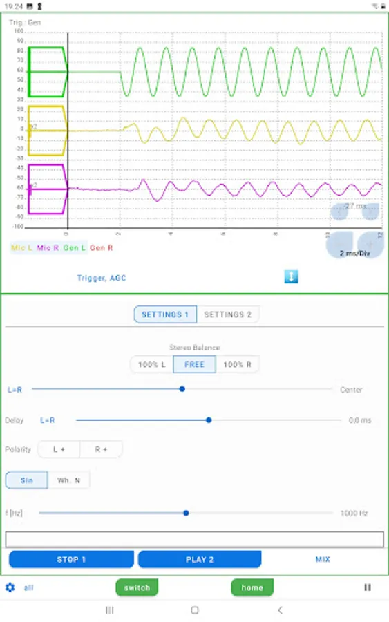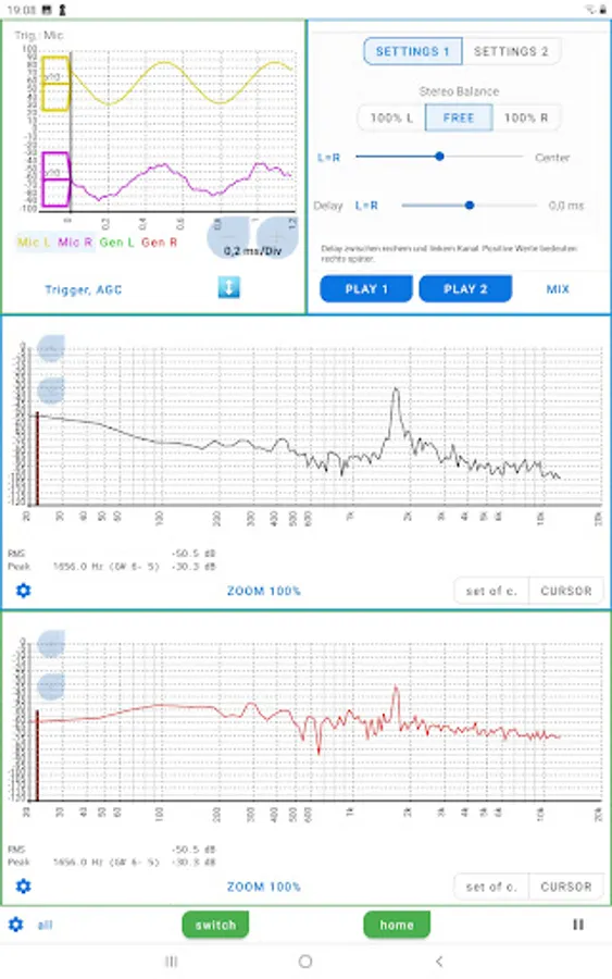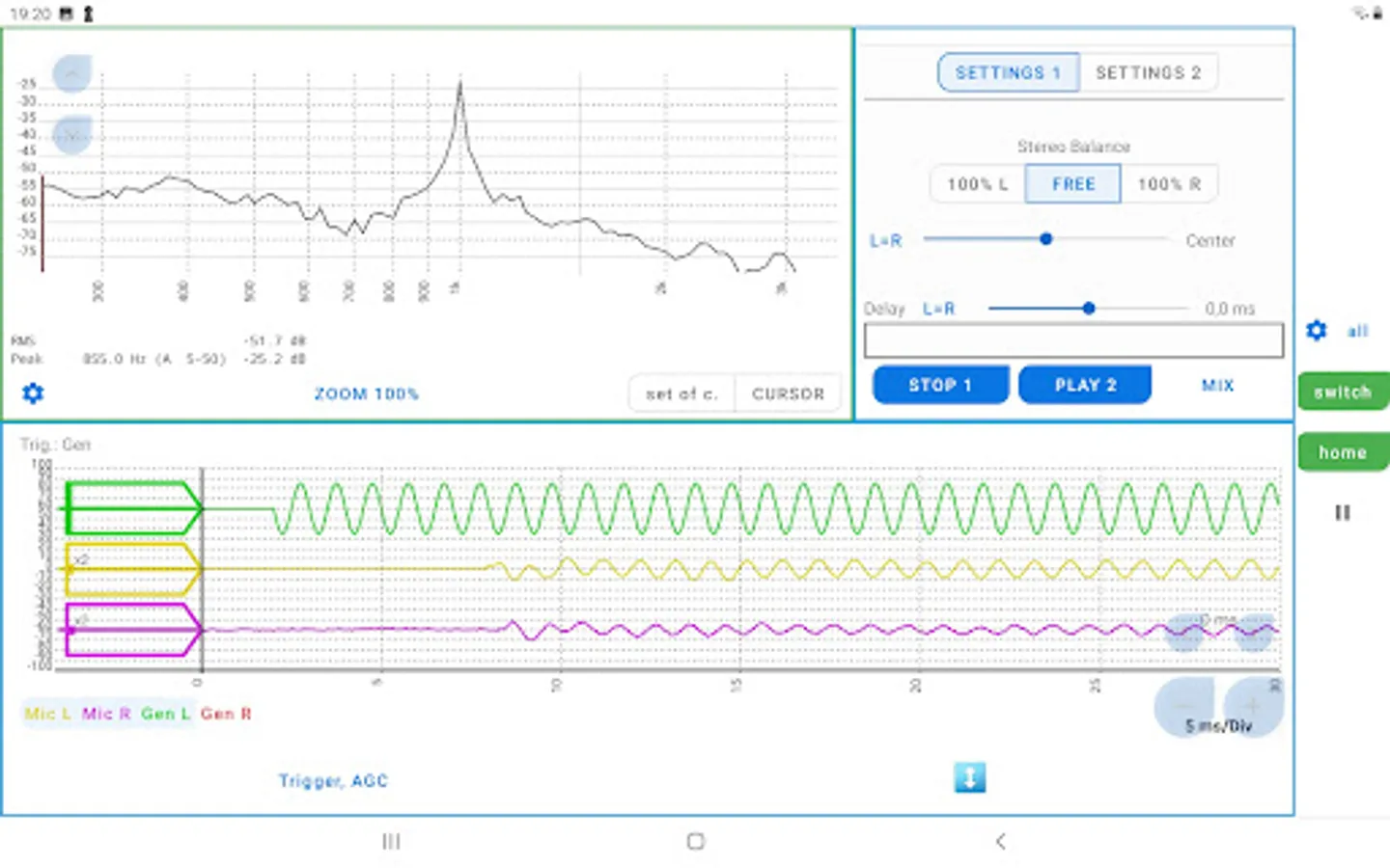 - Two views, freely configurable with oscilloscope, function generator, real-time analyzer and spectrogram
