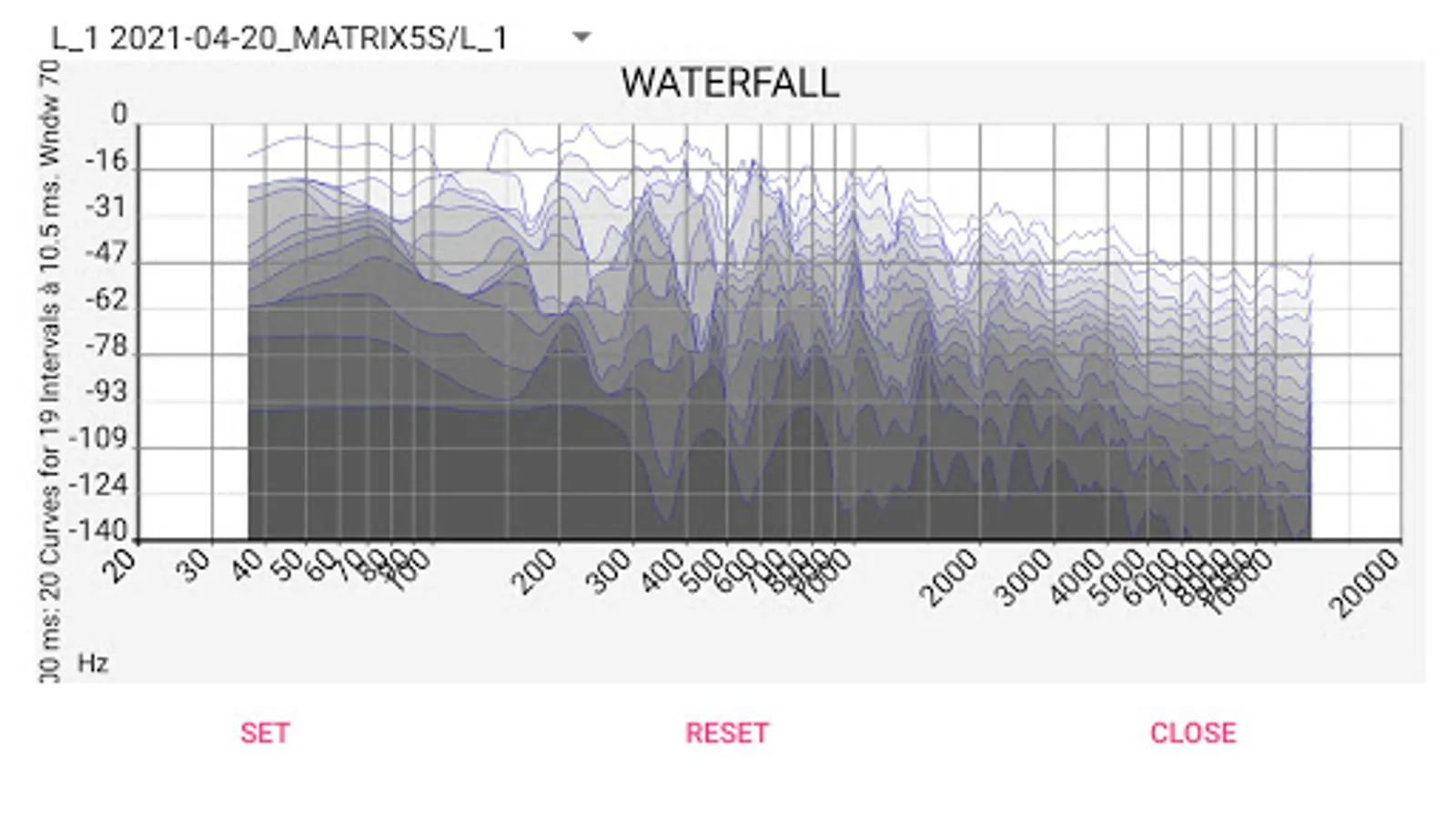 - Waterfall display (time evolution of frequency response) via wavelet or FFT analysis