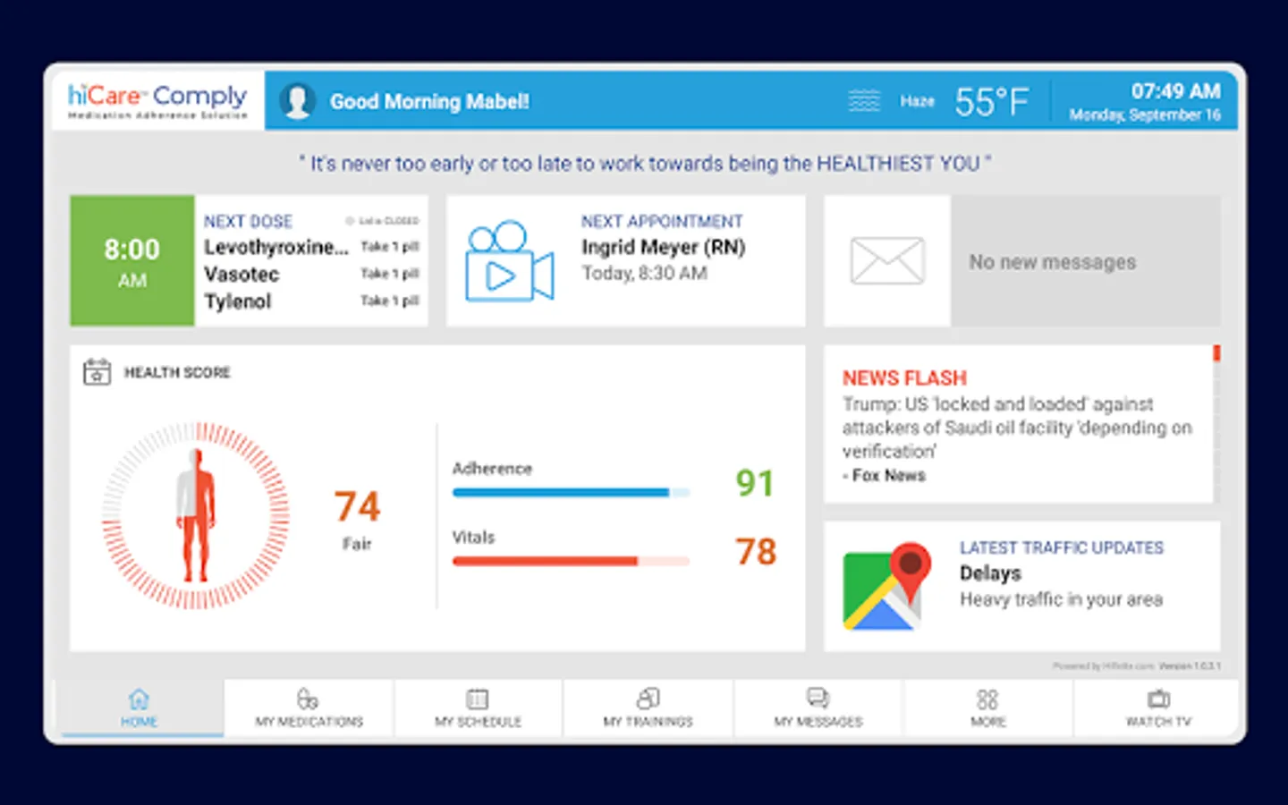 • hiCare Comply increases adherence to medication schedules, which in turn can help improve health outcomes.